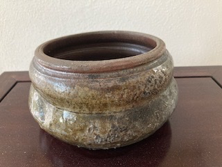 Bizen Keramik, Durchmesser 13 cm, mit deutlicher Ascheanflugglasur und regelrecht versinterter Oberfläche. Ein archaisches Stück, das die Ideale von Wabi und Sabi besonders zur Geltung bringt. Signiert, Künstler nicht zu ermitteln. 90.-€